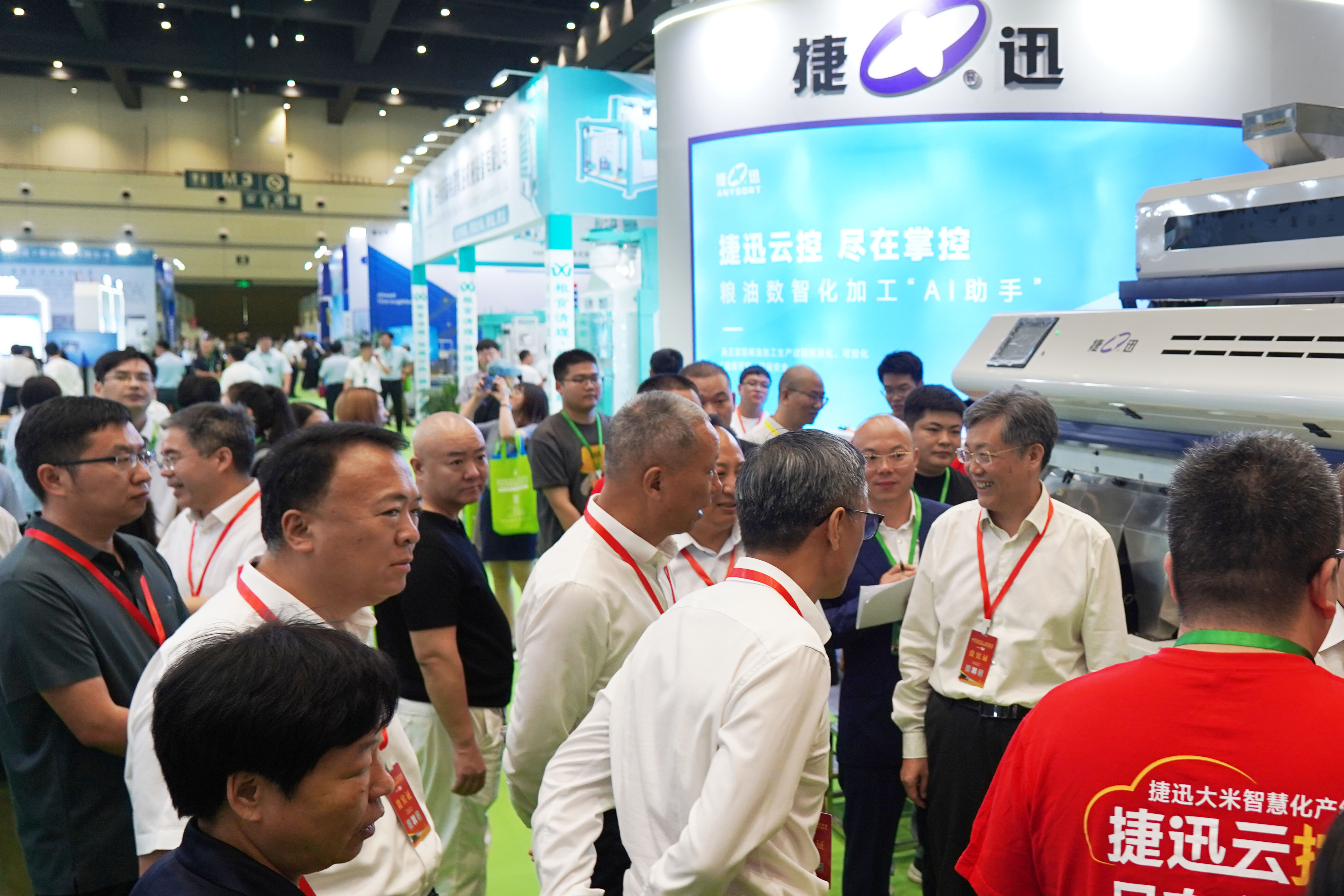 展會首日,河南省人民政府副省長李酌,河南省人民政府副秘書長盧東林,河南省糧食和物資儲備局局長張弓,國家糧食和物資儲備局河南局黨組書記、局長李強、河南省糧食行業協會會長劉大貴等領導一行專程來到捷迅展臺,詳細了解捷迅云控智慧產線解決方案的情況,并積極肯定了捷迅云控是糧油加工新質生產力的優秀創新成果,對河南乃至全國的糧食加工創新變革有巨大的推動作用。