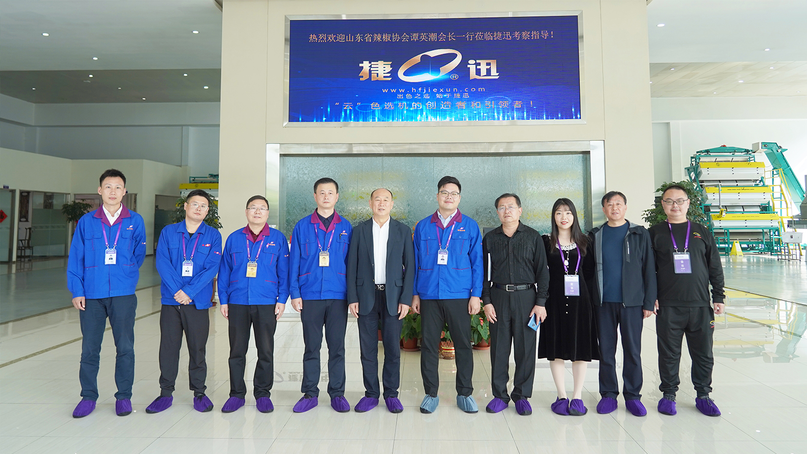 為促進辣椒產業高質量發展,山東省辣椒協會會長、中椒英潮辣業發展有限公司董事長譚英潮一行領導團隊于10月11日走進捷迅光電,深入交流捷迅辣椒質選解決方案。