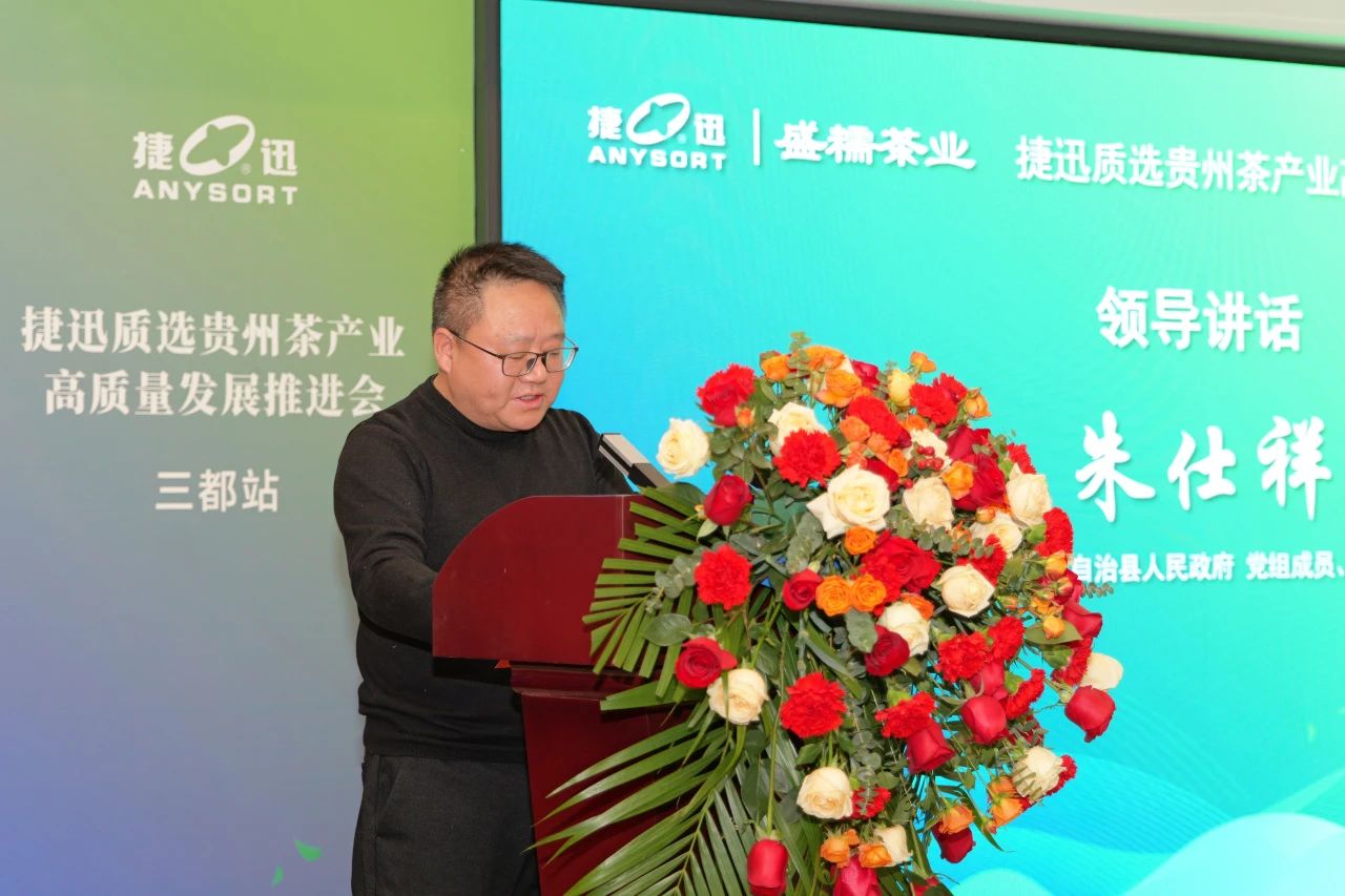 ? 三都水族自治縣副縣長朱仕祥講話中,介紹了三都縣茶產業發展的資源優勢與發展機遇,并對捷迅茶葉質選科技賦能三都茶產業所做出的貢獻表示了極大的肯定。